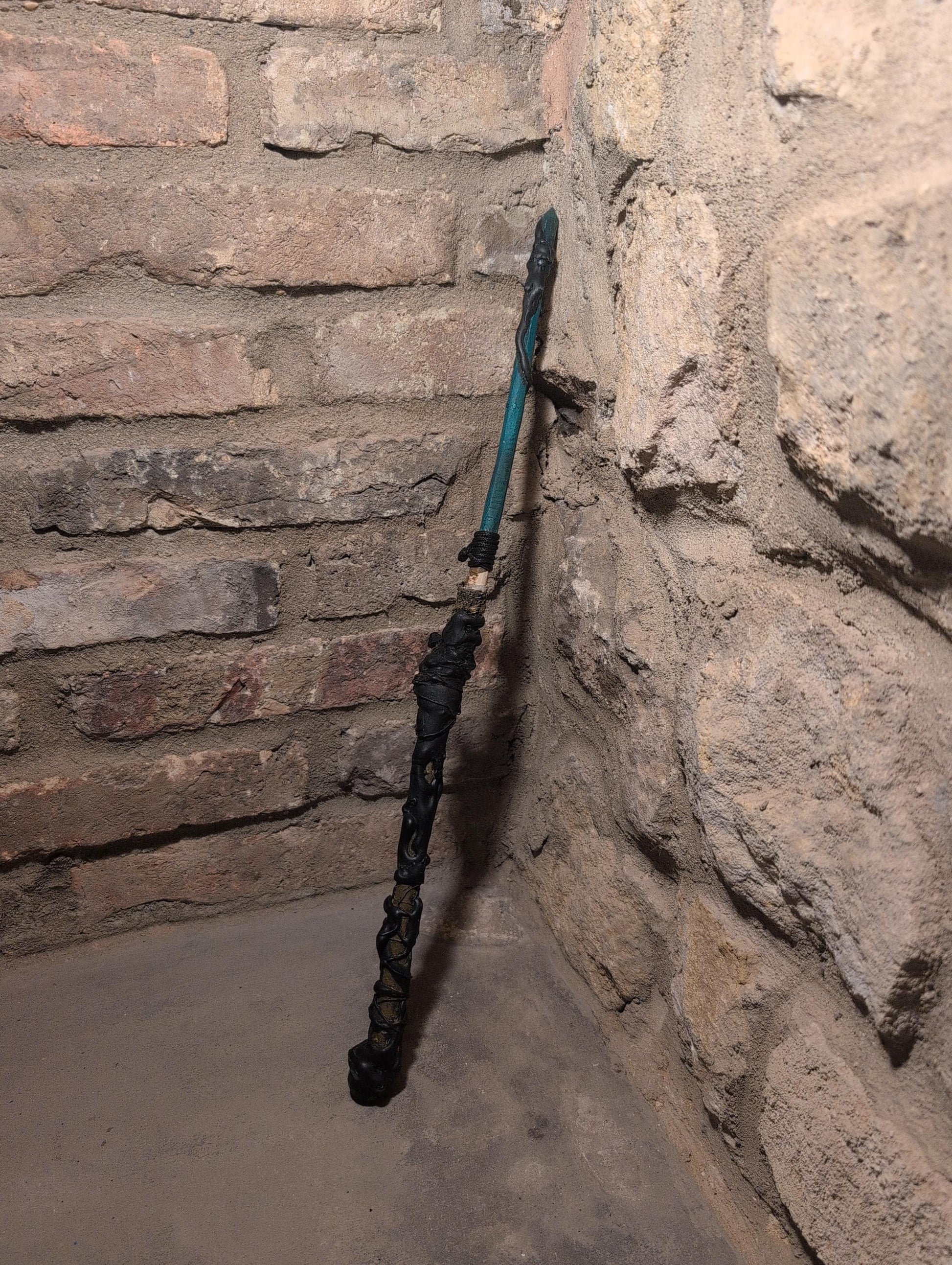 The wooden shaft is painted green to echo the energy of the forest, bound at the centre with black rope and metal chain for protection and focus. The handle is hand-sculpted from black resin, with vine-like textures that feel powerful in the hand, and is adorned with shimmering costume jewellery accents for an extra touch of magic.